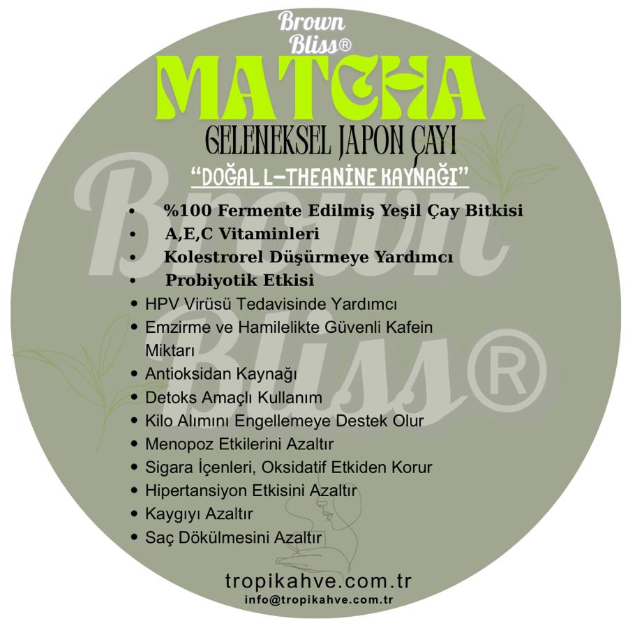 • Doğal İçerik: %100 organik matcha çayı, katkı maddesi veya yapay tatlandırıcı içermez.